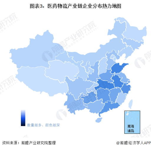 医药物流产业链区域热力地图:主要分布在华东地区,沿海地区大型企业较多