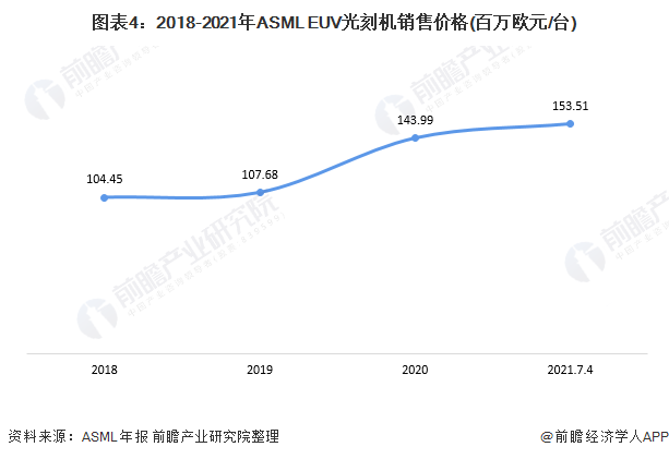 根据该公司的EUV光刻机售价显示,2018年以来,该公司的EUV光刻机价格也不断上扬,2021年7月4日,约为1.54亿欧元/台,折合人民币11.7亿元(以1欧元兑7.6元人民币换算)。