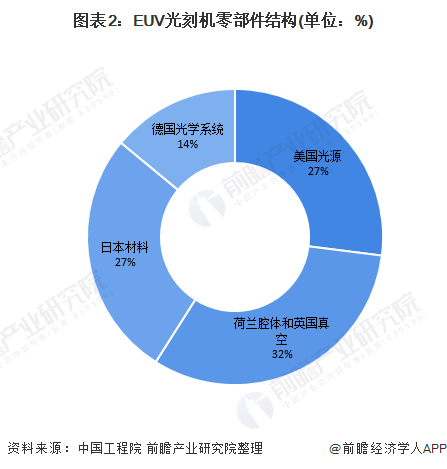 光刻机是技术壁垒极高的产品,而EUV光刻机制造更是“难上加难”,不仅体现在技术设计方面,还在于零部件供应,一台顶尖的EUV光刻机包含了10万多个零部件,全球供应商超过5000家,从光刻机的结构分析来看,美国光源占27%,荷兰腔体和英国真空占32%,日本材料占27%,德国光学系统占14%。因此,仅从零部件供应来说,光刻机涵盖的产业链就十分庞大。