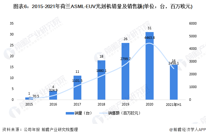 从ASML-EUV光刻机的销售情况来看,2015-2020年,EUV光刻机销量由1台提升至31台,销售额也从0.7亿欧元增长至44.64亿欧元,呈高速增长态势。2021年上半年,据公司公布的二季度业绩信息显示,公司已销售了16台EUV光刻机,总价值达24.56亿欧元。