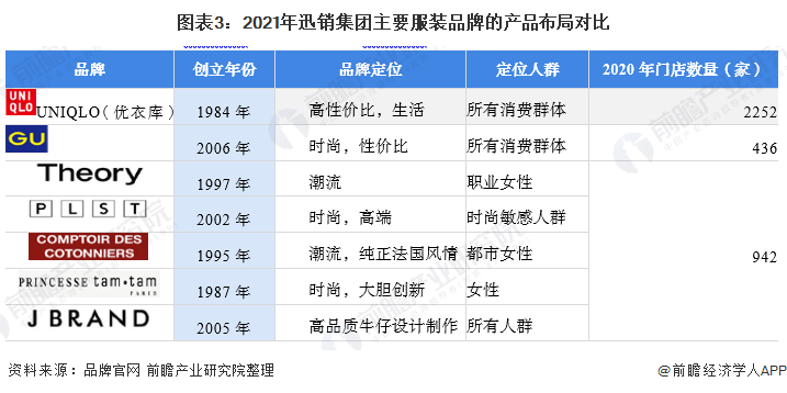 根据集团的年报、官网信息显示,2021年,迅销(Fast Retailing)是一家全球领先的服装零售公司,旗下品牌包括UNIQLO,GU和Theory等品牌;其中优衣库的门店数量最高,在2020年达到2252家店。