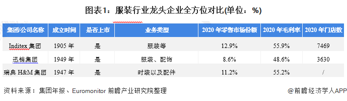目前,全球服装行业的龙头企业包括:Inditex集团、迅销集团、瑞典H&M集团: