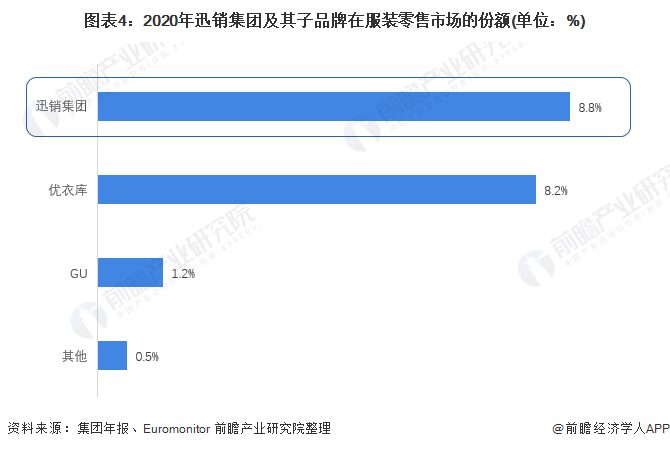 根据集团年报、Euromonitor的数据显示,2020年,迅销集团在服装零售市场的占有率达8.6%,;而从子品牌的市场份额来看,优衣库以8.2%的市场份额排名位列迅销集团品牌中的首位;其次是GU,以1.2%的市场份额排名迅销集团品牌中的第2位。