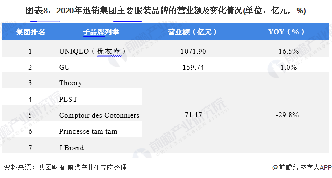 从集团主要品牌的销售情况来看,2020年,其中,核心品牌优衣库(UNIQLO)2020年销售额为1071.90亿元(人民币),占全部收入的82.2%,品牌销售占比排名第一