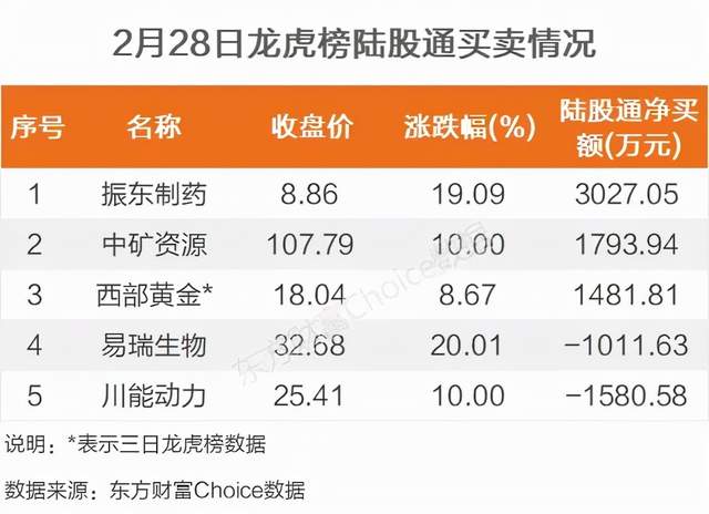 陆股通参与龙虎榜中个股共涉及5股,其中3股被陆股通净买入,振东制药被买入最多,为3027.05万元。另外2股被陆股通净卖出,川能动力被卖出最多,为1580.58万元。