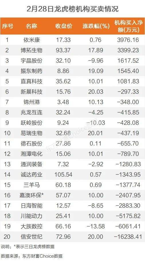 机构参与龙虎榜中个股共涉及20股,其中5股被机构净买入,依米康被买入最多,为3976.16万元。另外15股被机构净卖出,信安世纪被卖出最多,为1.62亿元。