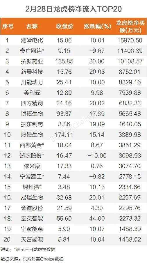 2月28日,上榜龙虎榜个股中,资金净流入最多的是湘潭电化,为1.6亿元。数据显示,该股日内涨停收盘,报收15.06元,全天换手率8.3%,离历史最高价15.19元已近在咫尺。资金净流入居前的华鑫上海分公司净买入5120.62万元。