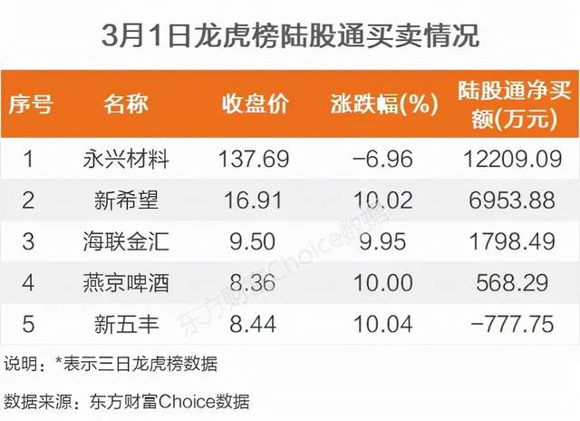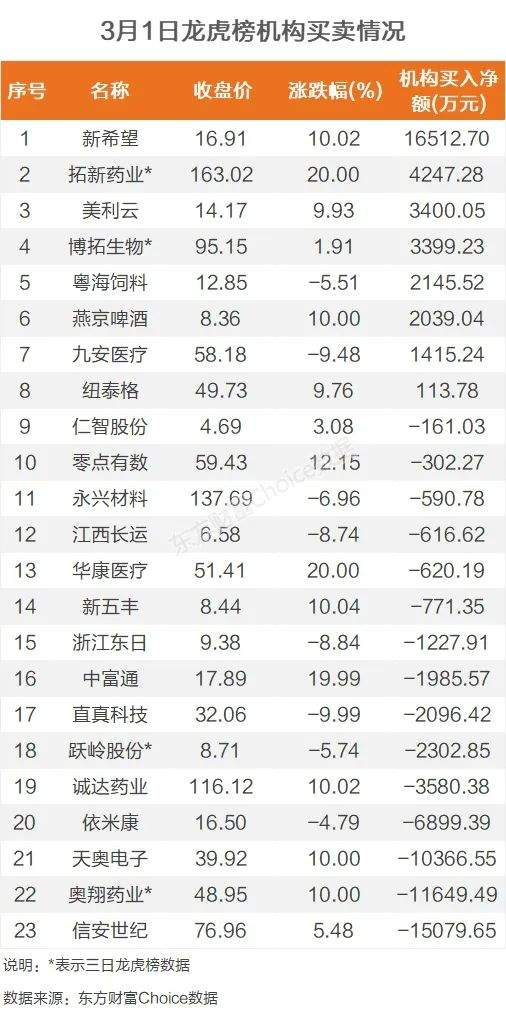 3月1日,上榜龙虎榜个股中,资金净流入最多的是新希望,为1.7亿元。数据显示,该股日内涨停收盘,全天换手率2.82%。资金净流入居前的深股通席位净买入6953.88万元,中金上海分公司净买入4571.68万元。
