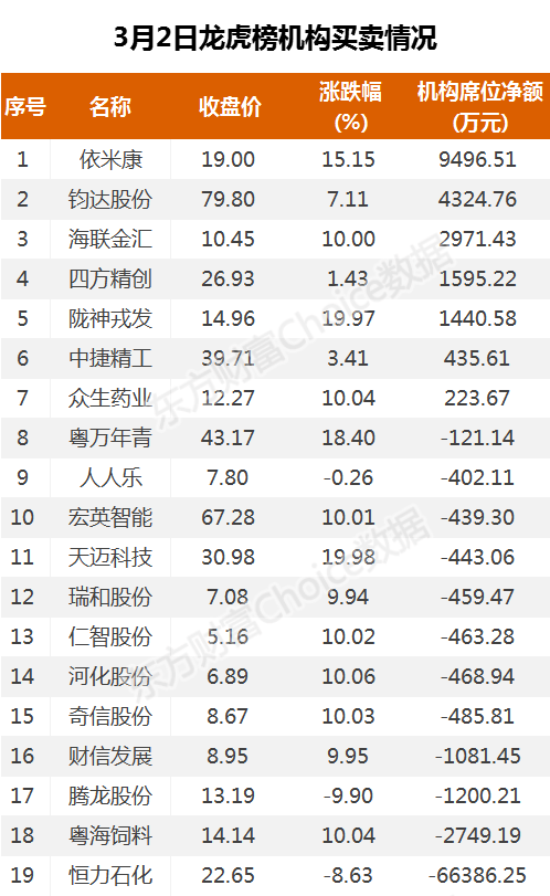 机构参与龙虎榜中个股共涉及19股,其中7股被机构净买入,依米康被买入最多,为9496万元。另外12股被机构净卖出,其中恒力石化卖出最多,为6.6亿元。