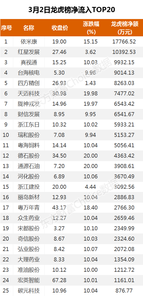 3月2日,上榜龙虎榜个股中,资金净流入最多的是依米康,净买额超17亿元。数据显示,该股日内涨超15,近3个交易日股价累计上涨10.47%,日内换手率147%。