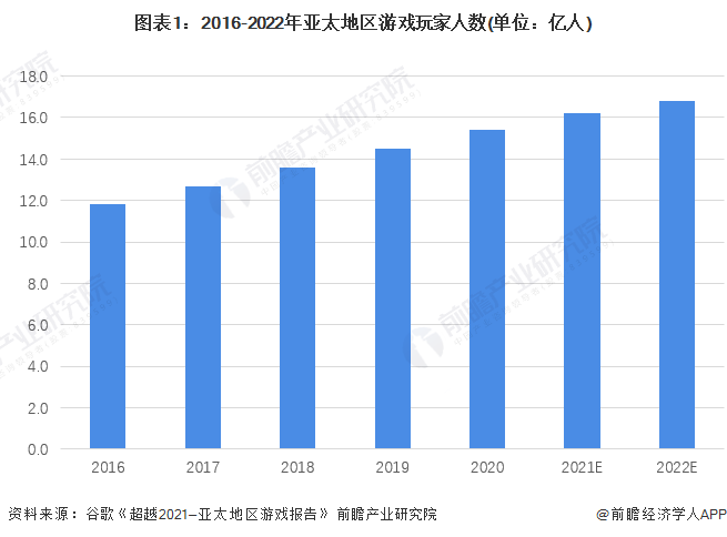 根据谷歌发布的《超越2021—亚太地区游戏报告》,2016-2020年亚太地区的游戏玩家数量持续增长,到2020年底,游戏玩家数量已经达到15.4亿人,2021年估算数据为16.2亿人,到2022年底预期将接近17亿人。