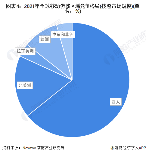 从亚太地区移动市场规模占全球的比例看,2021年亚太地区移动游戏市场规模占比超过60%,位居第一。