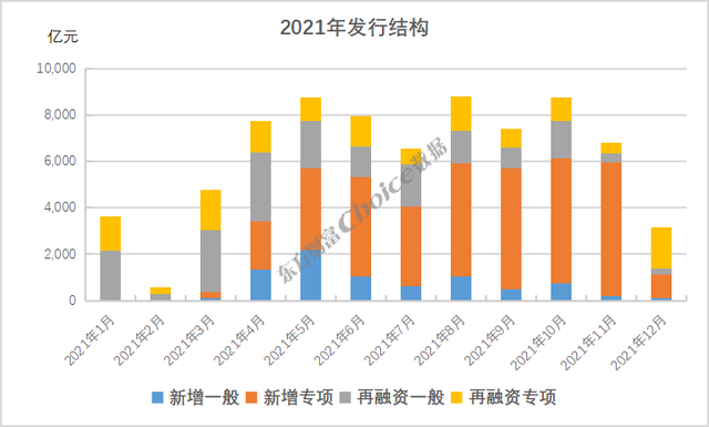 2021年全国发行地方债74,826亿元,其中新增债券43,637亿元(含新增一般债7,832亿元,新增专项债35,805亿元),再融资债券31,190亿元(含再融资一般债17,804亿元,再融资专项债13,386亿元)。其中新增一般债完成度达到97.5%,新增专项债完成度达到98.1%,全年限额基本使用完毕。