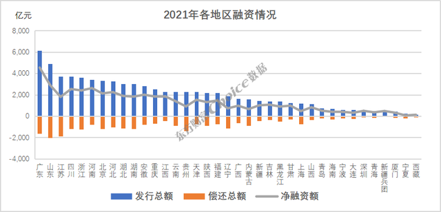 分区域来看,在不将计划单列市归省计算的口径计算,在2021年有19个地区净融资额超过千亿。其中广东、山东、江苏、四川、浙江、河南、北京、河北、湖北发行规模超三千亿,山东、江苏、广东、贵州、浙江、湖南、北京、四川、辽宁、湖北、河北偿还规模超千亿。