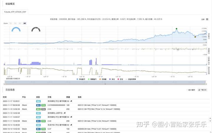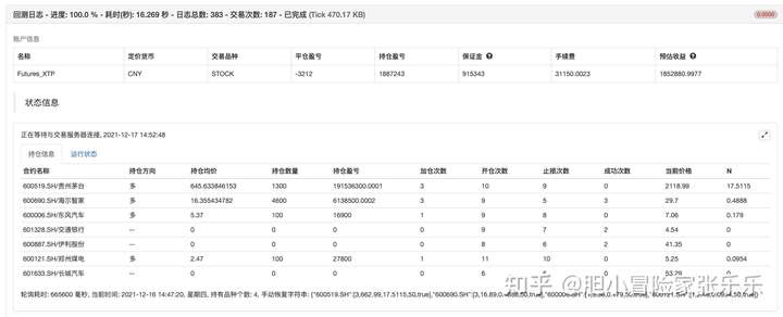 涨幅较大的贵州茅台贡献了整体收益的绝大部分,看来选股也是十分重要的因素。并且根据状态栏中显示的统计数据来看,海龟交易法的止损次数要远高于策略成功盈利次数。这也是策略的思路核心,用较小的头寸试错。一旦抓住趋势突破加仓,抓住肥尾。创造震荡期损失数倍的盈利。