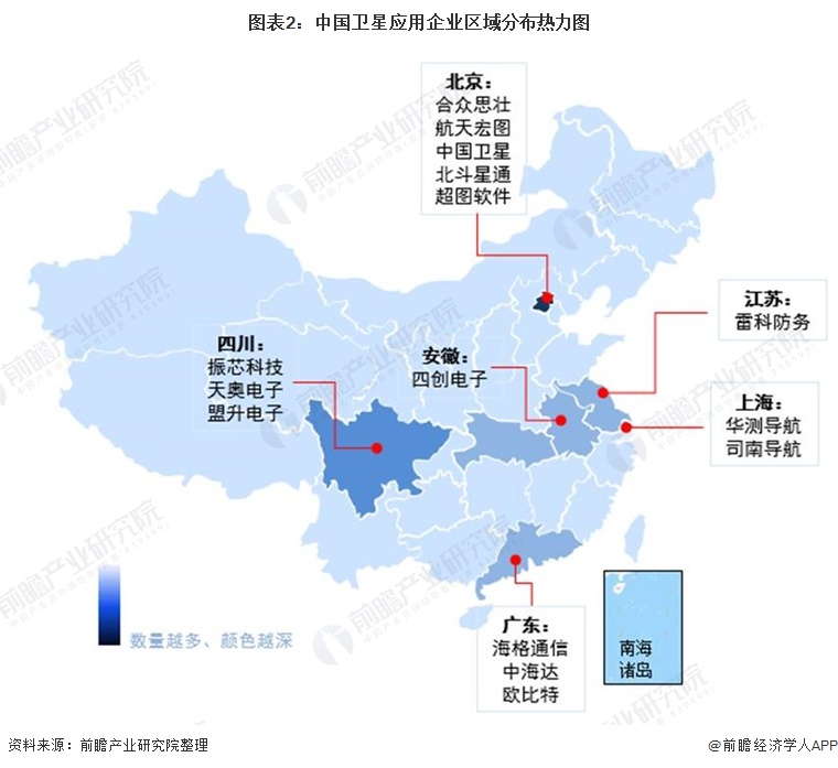目前我国卫星应用企业业务大多布局在国内,尤其是华北、华东地区,合众思壮和北斗星通布局范围相对较广,海外业务占比较大。企业布局最多的领域是卫星导航应用领域,其次是遥感应用领域,通信应用领域布局企业较少。其中,中国卫通作为我国卫星通信应用领域的领头羊,占国内卫星通信市场份额达80%以上。
