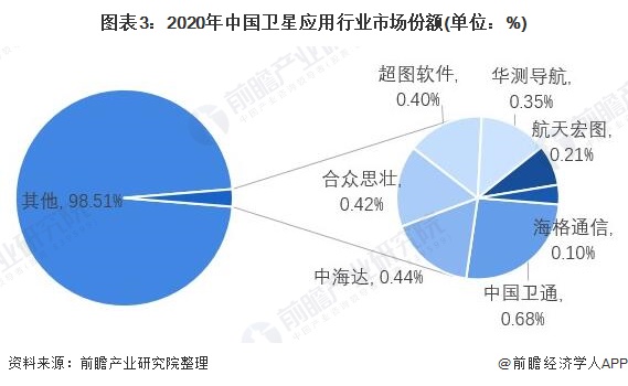 近年来随着北斗三代卫星导航系统的全面建成以及国家政策的逐渐开放,我国掀起一股商业航天热潮。伴随卫星产业链下游应用向民用领域快速拓展,大量民营企业开始参与卫星应用行业,市场竞争较为激烈,行业内企业的市场份额普遍较小。前瞻根据2020年我国卫星应用行业主要企业卫星应用业务的营业收入占行业市场规模比重,测算得出2020年我国卫星应用行业主要企业所占市场份额,结果如下: