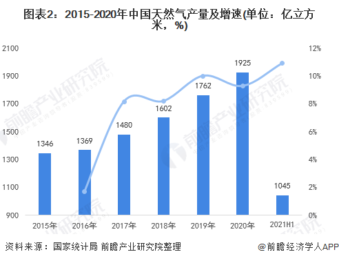 在天然气开发方面,2015-2020年,中国天然气产量逐年递增,增速整体上升。根据国家统计局数据, 2020年,生产天然气1925亿立方米,同比增长9.27%。