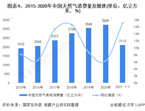 2021年1-7月,我国天然气表观消费量2112亿立方米,同比增长17.1个百分点。