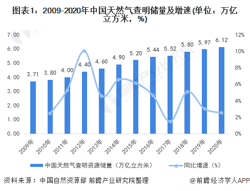 根据中国自然资源部数据,2009-2020年,中国天然气探明储量也不断增长,增速波动变化,并在近几年逐年下滑。2020年,中国天然气查明储量预计可达6.12万亿立方米,同比增长2.5%。