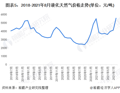 进入2021年后,我国天然气价格一路上行,2021年8月,我国天然气价格已升至5565元/吨。