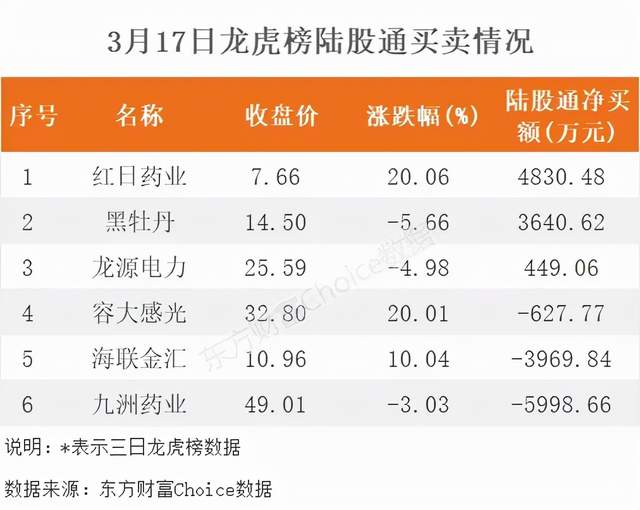 陆股通参与龙虎榜中个股共涉及6股,其中3股被陆股通净买入,红日药业被买入最多,为4830.48万元。另外3股被机构净卖出,九洲药业被卖出最多,为5998.66万元。