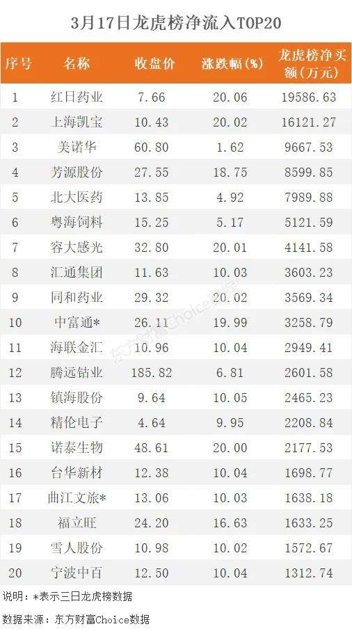 3月17日,上榜龙虎榜个股中,资金净流入最多的是红日药业,为1.96亿元。数据显示,该股日内20CM大号涨停,全天换手率15.11%。资金净流入居前的中信上海溧阳路净买入5551.59万元;国泰君安上海分公司净买入4978.79万元;深股通席位净买入4830.48万元。