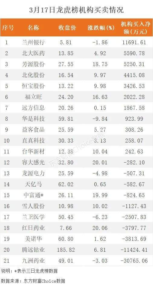 机构参与龙虎榜中个股共涉及21股,其中11股被机构净买入,兰州银行被买入最多,为1.17亿元。另外10股被机构净卖出,九洲药业被卖出最多,为3.08亿元。