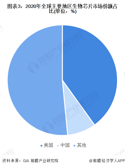 根据GIA信息显示,2020年,美国生物芯片市场规模为52亿美元,占全球市场份额的40.1%;中国生物芯片市场规模约为11亿美元,占全球市场份额的8.4%。两国市场份额之和占据了全球市场的半壁江山。