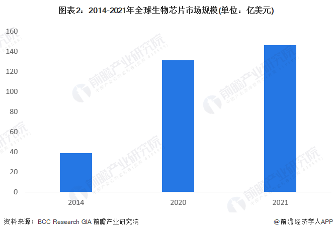 从全球范围来看,生物芯片市场的发展主要受生物芯片技术驱动。2016年4月,美国市场调研公司BCC Research发布的《全球生物芯片市场调查报告》显示,2014年全球生物芯片产品市场已达39亿美元。由全球行业分析师公司(GIA)一项覆盖3911位高管、69家包括Agilent Technologies, Inc、Bio-Rad Laboratories, Inc等公司、涉及全球主要地区的调查报告显示,在COVID-19危机中,2020年全球生物芯片市场为131亿美元,2021年全球生物芯片市场规模超过145亿美元。