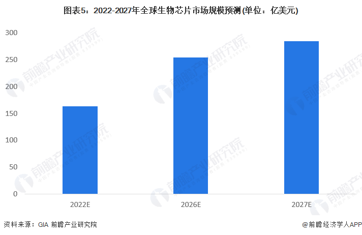 在全球范围内推动生物芯片市场增长的突出因素之一是慢性病患病率的增加,尤其是在世界各国快速增长的老年人口中。癌症发病率的增加也增加了生物芯片在早期识别癌细胞方面的应用。COVID-19大流行还导致许多制药和生物技术公司更加关注制造能够检测冠状病毒的更先进的生物芯片。生物芯片已被多家公司成功用于开发COVID-19诊断测试。随着全球生物芯片技术的发展,应用深度及广度的逐渐增加,2022年全球生物芯片市场规模将达到约160亿美元,2027年全球生物芯片市场规模有望超过280亿美元。