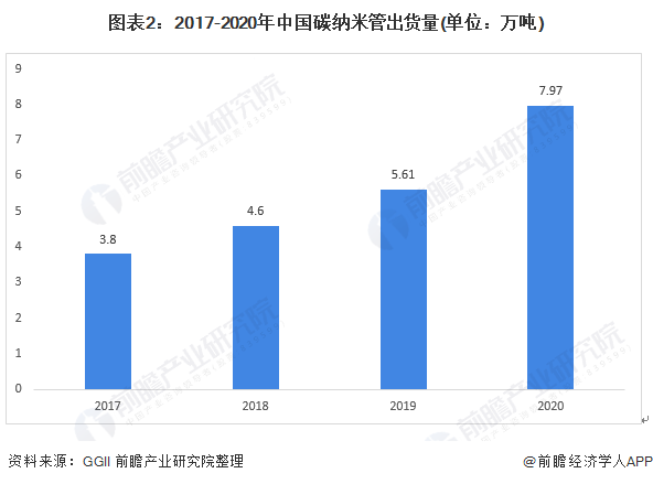 近两年中国新能源汽车市场由于补贴大幅退坡及其他因素影响,市场进入短暂调整期,导致动力电池出货量增速放缓,甚至出现下滑,这导致碳纳米管导电剂出现短期供需失衡,但受益于技术升级的带动,该材料市场增速表现好于下游锂电池市场。同样受益于动力电池市场规模需求的增长,近几年碳纳米管出货量呈现快速增长态势。结合高工产研锂电研究所(GGII)年复合增长率数据,前瞻测算2020年国内碳纳米管出货量达到7.97万吨。