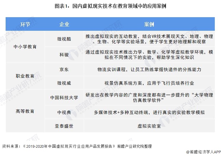 VR/AR教育培训通过VR/AR技术来构建虚拟的学习体验,学生由被动接受向自主体验升级,有助于提升教学质量和行业培训效果。按照应用场景划分,虚拟现实技术在教育领域的应用主要包括中小学教育、职业教育、高等教育等方面。自从2016年VR/AR市场爆发以来,微视酷、科骏、微视威、中视典、亚泰盛世等企业纷纷布局VR/AR教育市场。