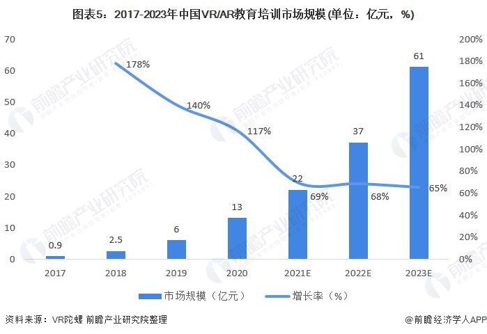 近年来我国VR/AR教育培训市场快速增长,根据VR陀螺数据显示,2020年我国VR/AR教育培训市场规模为13亿元,同比增长117%;随着政策的鼓励和市场的驱动,VR/AR教育市场将持续增长,到2023年这一市场规模将到达61亿元。