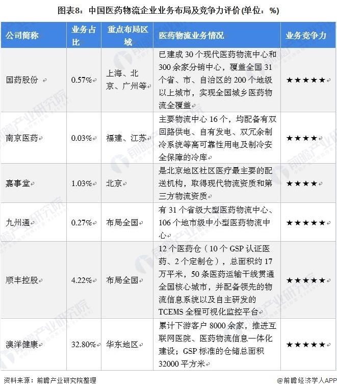 从医药物流企业物流布局来看,九州通、顺丰控股布局重点覆盖全国,物流覆盖范围较广;从业务占比来看,物流业务占比普遍较低,其中,澳洋健康的医药物流业务占比达32.8%,顺丰控股医药物流业务收入占比达4.22%。从业务竞争力来看,布局范围较广的企业,业务竞争力较强。