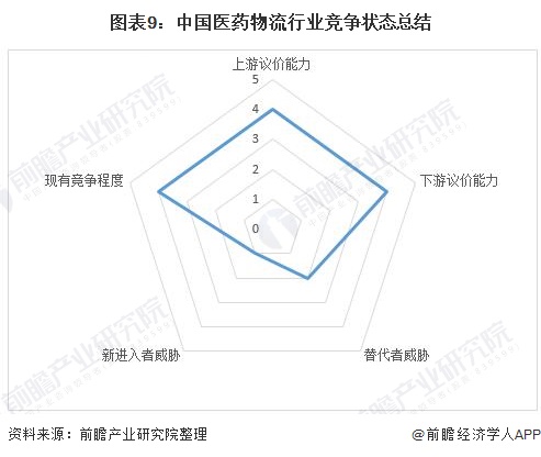 根据以上分析,对各方面的竞争情况进行量化,5代表最大,0代表最小,目前我国医药物流行业五力竞争总结如下: