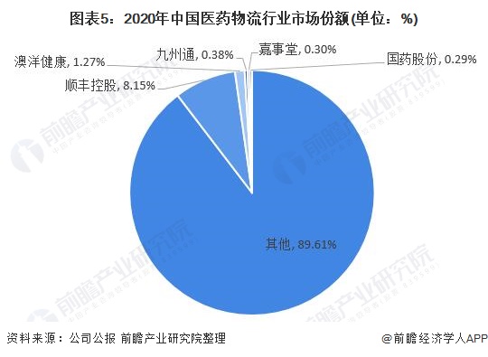 根据中物联医药物流分会数据,2019年我国医药物流费用总规模为677.71亿元,2020年,根据冷链物流费用占比测算医药物流市场规模,2020年我国医药物流市场规模为797亿元。2020年,根据上市公司披露的物流收入来看,顺丰控股市场份额占比最高,为8.15%,其次为澳洋健康,占比为1.27%。