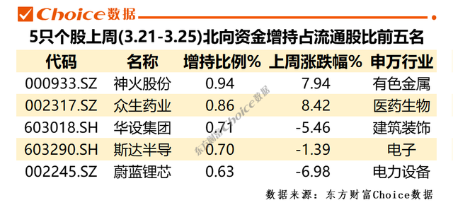 东方财富Choice数据沪深股通中央结算持股记录显示,上周(3.21-3.25),个股增持占流通股比前五名中,神火股份、众生药业、华设集团增持比例居前。
