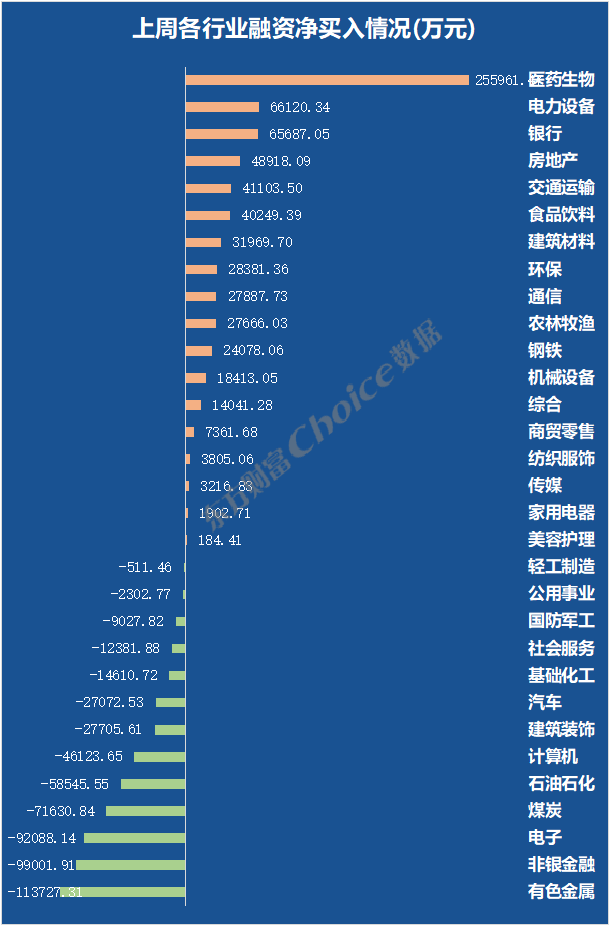 从行业分布来看,截至3月25日,上周(3.21-3.25)融资净买入排名前五的行业分别是医药生物、电力设备、银行、房地产和交通运输。