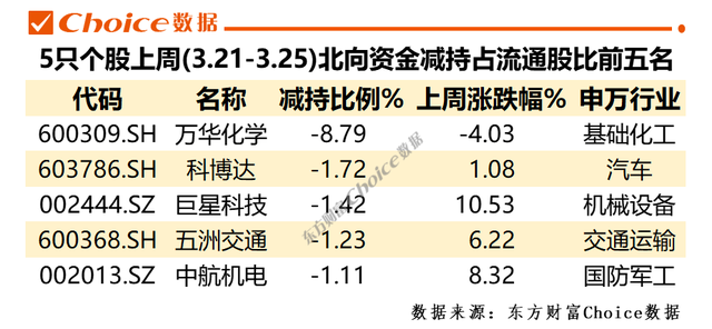北上资金个股减持占流通股比前五名中,万华化学受解禁影响,北向资金减持比例高达8.79%,科博达、巨星科技等减持占比紧随其后。