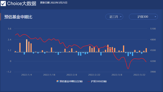 Choice另类数据中心显示,截至3月25日,近三月预估基金平均申赎比为1.14,市场普遍看涨。