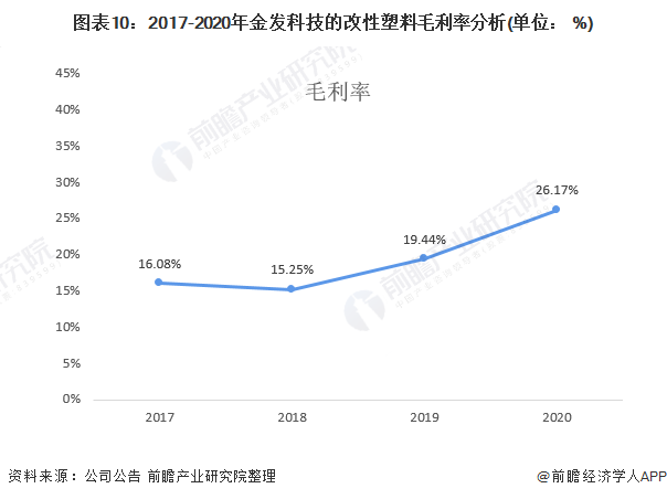 从改性塑料业务的毛利率来看,2017-2020年,金发科技改性塑料业务毛利率总体呈波动态势。2020年金发科技改性塑料业务毛利率为26.17%,相较于2019年上升了6.73个百分点。