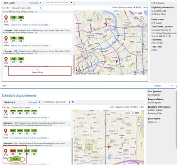 (3)选择考试的时间和考点(南京有4个考点,考生可以根据需求选择),点击MORE SITES查看所有的南京CFA考点,再进行考点的选择,接着勾选考试的日期;