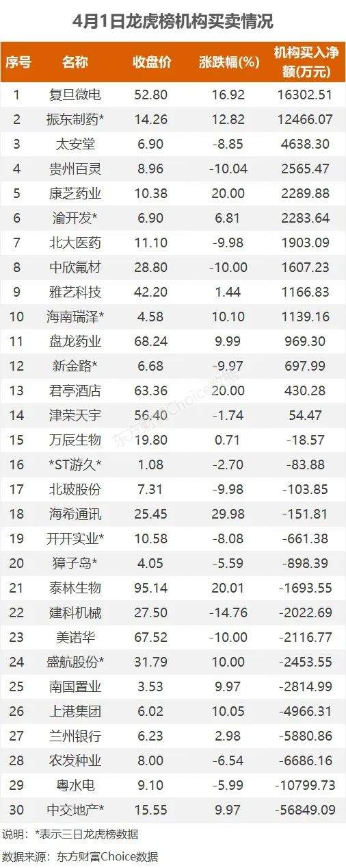 机构参与龙虎榜中个股共涉及30股,其中14股被机构净买入,复旦微电被买入最多,为1.63亿元。另外16股被机构净卖出,中交地产被净卖出最多,三日净卖出5.68亿元。