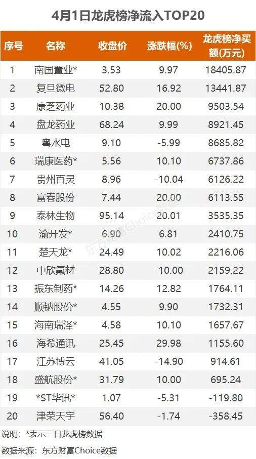 4月1日,上榜龙虎榜个股中,资金净流入最多的是南国置业,三日净流入1.84亿元。数据显示,该股日内涨停收盘,近三日累涨33.21%。资金净流入居前的华鑫上海宛平南路三日净买入4694.79万元。