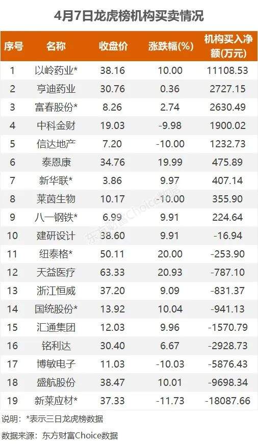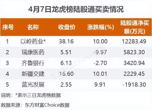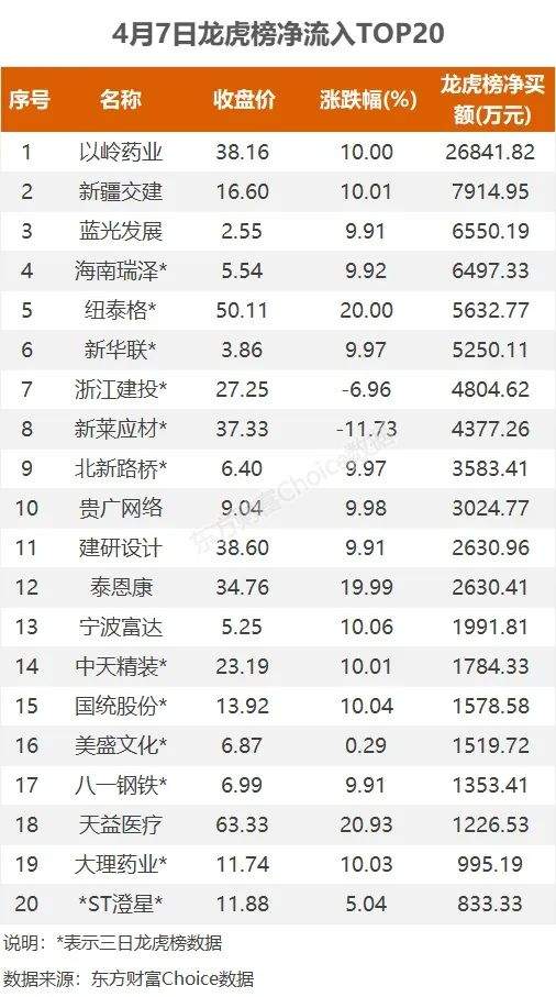 4月7日,上榜龙虎榜个股中,资金净流入最多的是以岭药业,为2.68亿元。数据显示,该股日内涨停收盘,股价再创历史新高。资金净流入居前的国泰君安上海分公司净买入2.14亿元;深股通净买入5593.59亿元。