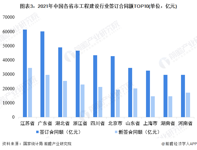 从中国各省市工程建设行业签订合同额状况来看,2021年,江苏省签订合同额及新签合同额依旧处于全国首位,分别为61442.95亿元和34608.65亿元。广东省签订合同额及新签合同额增长较快,分别为60265.35亿元和29647.62亿元,与江苏省差距继续缩小,未来发展实力强劲。总产值排名第二的浙江省,在签订合同额及先前合同额方面,排名下滑至第四位,行业未来发展可能受到一定影响。