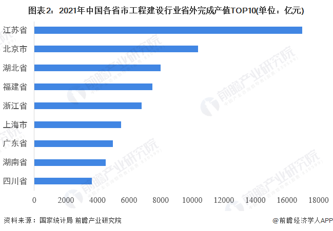 从中国各省市工程建设行业省外完成产值状况来看,2021年,江苏省凭借自身强劲实力,在省外完成产值中再次排名第一,省外完成产值16959.22亿元,占江苏省工程建设总产值的44.34%。值得注意的是,北京市以10369.92亿元的省外产值排名第二,占其总产值的比例达到了74.14%,省外工程建设已成为北京工程建设行业的主要市场。