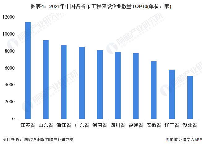 中国各省市工程建设企业数量来看,2021年,江苏省工程建设行业企业数量超过了11000家,是唯一工程建设企业数量过万的省市。山东省以9297家工程建设企业排名第二,浙江省则以8750家的数量位居第三。