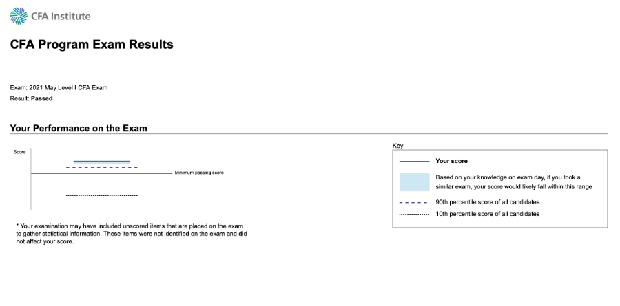 考生在完成CFA一级/CFA二级考试之后,协会会专门向考生发送成绩单,如果考生已经通过考试的话,成绩单显示的结果为“pass”,也就是“result”一栏的结果为“pass”,考生可以将成绩单打印下来,作为证明材料。